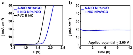 Finally, we performed a full-cell test using a two-electrode cell configuration in 1 M KOH with the A-NiO NPs/rGO as the negative electrode and the NiO NPs/rGO as the positive electrode by coating the catalyst ink on the Ni foam. For comparison, Pt/C and Ir/C were used as the cathode and anode under the same conditions, respectively. As shown in Video S1, oxygen bubbles are generated from the anode coated with NiO NPs/rGO (left side), and hydrogen bubbles are released from the cathode coated with A-NiO NPs/rGO (right side). Figure 6a shows that noble metal-based catalysts have ~1.58 V of potential at 10 mA cm−2, whereas the A-NiO NPs/rGO in the cathode and the NiO NPs/rGO in the anode demonstrates ~1.82 V at the same condition. In addition, the long-term durability of our non-precious catalysts was evaluated for 12 h under a constant potential of 2.00 V (see Figure 6b). It was observed that the current density remained almost unchanged while maintaining approximately 20 mA cm−2 during measurement, confirming its stability for overall water splitting.