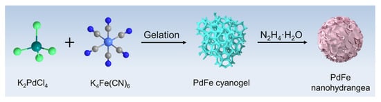 In addition, morphology control is another efficient method to affect the catalysts’ electrochemical properties. Porous nanostructures can enhance the atoms’ utilization efficiency of noble metals and possess a much larger surface area, providing abundant active sites, which can improve the activity [22,23,24]. What is more, the porous nanostructures not only can facilitate mass diffusion and transport but also hinder the dissolution and agglomeration of nanocatalysts. Hence, enormous efforts have been made to develop synthetic approaches to prepare Pd-based nanocatalysts with porous structures, including self-assembly [25], electrodeposition [26,27], hard template-engaged method [28,29], and so on. Despite these advances, those previously reported synthetic strategies are tedious and complex, dramatically impeding the large-scale practical applications of these nanomaterials in energy-related fields. Thus, it is greatly fulfilling to design a gentle and economical method for the preparation of Pd-based alloys with porous structure. Cyanogel is a category of coordinate polymer made from the reaction of a tetrachlorometalate ([RCl4]2−, R = Pt, Pd, Ir) and a transition metal cyanometalate ([M(CN)n]2−/3−, n = 4, 6; M = Fe, Co, Ni) in aqueous solution, as shown in Equation S1 (Supplementary Materials) [30,31,32,33]. Therefore, cyanogels can be used as various multi-metal precursors for the fabrication of bimetallic nanoalloys, avoiding the risk of alloy multiphases and complicated processes which frequently occur in the traditional reduction methods.