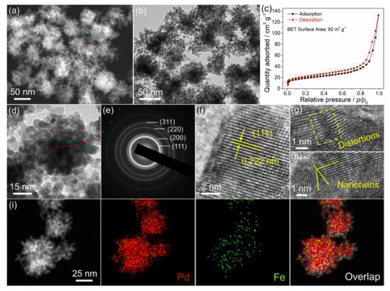 The morphology and nanostructure of the PdFe PNHs were characterized with SEM, HAADF-STEM, and TEM. As viewed from SEM images (Figure S3) and the HAADF-STEM image (Figure 2a), the PdFe PNHs exhibit a porous, hydrangea-like structure. Consistent with the SEM and HAADF-STEM observation, the TEM image further confirms the porous, hydrangea-like nanostructure composed of interconnected small nanoparticles (Figure 2b). N2 adsorption–desorption isotherms of the PdFe PNHs display a distinctive hysteresis loop corresponding to type IV behavior (Figure 2c), suggesting that the porous structures are existent. Calculated from the N2 isotherms, the BET surface area is around 92 m2 g−1. The abundant pores and large surface area of the PdFe PNHs can facilitate transportation and infiltration of the reaction substances, offering more active surface sites, which benefit electrocatalytic reactions. The HRTEM image (Figure 2d) and the corresponding SAED pattern (Figure 2e) suggest that the PdFe PNHs consist of multiple coalesced crystalline segments with a face-centered cubic (fcc) polycrystalline structure. As marked in Figure 2f, the lattice plane with an interplanar distance of 0.222 nm is vested in the (111) plane in fcc-phased PdFe alloy. Furthermore, distortions and nanotwins can also be observed in the HRTEM images (Figure 2g,h); these can be used as active sites for electrocatalysis. Elemental mapping analysis discloses that Pd and Fe are distributed uniformly throughout the nanohydrangeas entirely, proving the formation of PdFe alloys (Figure 2i). This conclusion is further proved by the corresponding EDX line-scanning analysis (Figure S4), where Pd and Fe signals appear incidentally during the line-scanning process.
