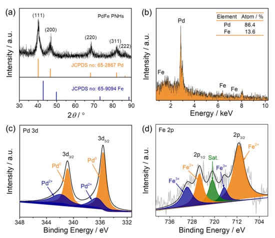 Compositional analyses of the porous PdFe nanohydrangeas. (a) XRD pattern; (b) EDX spectrum; (c) high-resolution Pd 3d XPS spectrum; (d) high-resolution Fe 2p XPS spectrum.