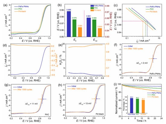 In addition, long-term stability is also a significant aspect of electrocatalysts to evaluate electrocatalytic performance. Accelerated durability tests (ADTs) for 1000 cycles were carried out to evaluate the ORR durability of the three catalysts (Figure 4f–h). The half-wave potential of the PdFe PNHs exhibits an unspectacular degradation with just 2 mV negative shift, which is much lower than the commercial Pt/C (11 mV) and Pd black (13 mV). Furthermore, the stability of the three catalysts was also tested by chronoamperometry (CA) measured in O2-saturated 0.1 M KOH for 24 h. As displayed in Figure 4i, the current intensity decay of PdFe PNHs is much lower than that of the commercial Pt/C and Pd black during the entire time range. The PdFe PNHs still maintain 93.2% of original current density after tests, whereas the current losses of commercial Pt/C and Pd black are 10.7% and 17.8% (inset of Figure 4i), respectively, implying that the PdFe PNHs have better stability as electrocatalysts of ORR. The outstanding ORR activity and stability of the PdFe PNHs can be put down to the unique porous, hydrangea-like morphology and alloyed components. Concretely, (i) the unique porous, hydrangea-like structure composed of interconnected small nanoparticles has a large surface area and abundant accessible active sites, which can boost mass diffusion and transport during the electrochemical course and eventually promote the reaction kinetics; (ii) the synergistic effects between Pd and Fe elements increase the efficient adsorption of active oxygen and migration of rival hydroxyl species on the surface of the PdFe PNHs, thus promoting the direct four-electron transfer and resulting in a superior ORR performance [39,40].