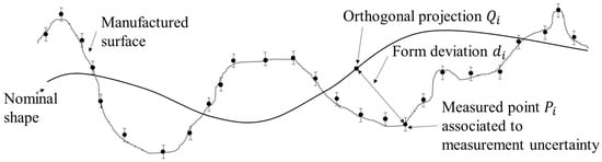 LS or MZ fitting are considered as an optimisation problem. Given a set of data points, , let is the generic equation describing the shape of the measured surface where is the space vector ( in Cartesian coordinates) and denotes the shape parameters. For each point, one could associate its orthogonal projection on the nominal surface denoted by . , where . is the Euclidean norm, which defines the orthogonal distance between the measured data points and the nominal surface, known as form deviation (Figure 1).