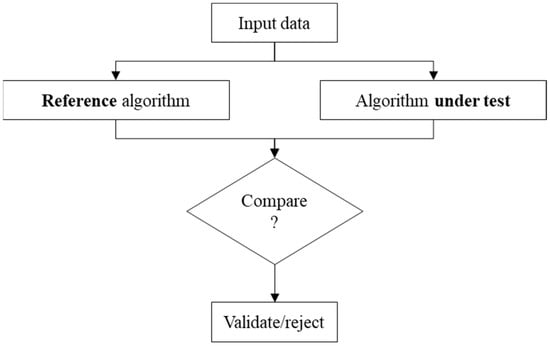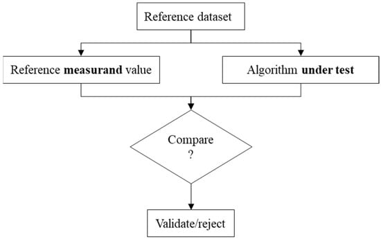 A second methodology to evaluate metrology algorithms is based on the use of reference algorithms defined in ISO 5436-2 2012 as “Type F2 algorithm measurement standards” [11]. There are traceable metrology algorithms against which the tested algorithm will be compared. A common set of data points is submitted to both metrology algorithms (reference algorithm and algorithm under test) and the two results are then compared in order to take an accept/reject decision (Figure 3). Reference algorithms do not exist for a wide range of applications in metrology. Their development is not always straightforward, especially for applications such as MZ fitting.