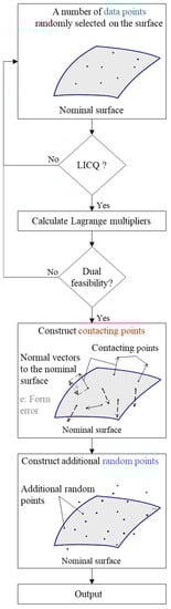 For MZ fitting, Forbes et al. [1] developed a method for the generation of reference softgauges with vertex solution. Similarly to LS fitting, the Karush–Kuhn–Tucker (KKT) optimality conditions for the MZ fitting problem are indispensable and the data points are generated such as to meet the number of conditions reported by Boyd et al. [25]. A set of points are selected on the nominal shape, such that the linear independence constraint qualification (LICQ) of the problem holds [26]. Then, equations resulting from KKT conditions are solved in order to determine the Lagrangian multiplier [25]. If the resulting Lagrange multipliers are not positive (dual feasibility does not hold), a new set of data points are chosen and the procedure is repeated. Once the dual feasibility condition is satisfied, the contacting points are constructed and additional random points are generated on the surface. A flowchart describing the proposed approach is illustrated in Figure 4.