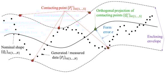 An active constraint could be interpreted as a point belonging to the measured data for which the distance to the reference surface is equal to the form error (“a contacting point to the enclosing envelope”) as illustrated in Figure 5. Whereas, this distance is lower than the form error for inactive constraint.