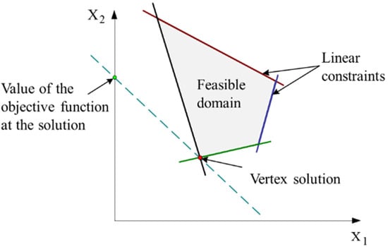 Representation of the vertex solution for the case of a linear programming involving the two variables X1 and X2.