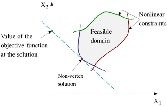 Representation of the non-vertex solution for the case of a nonlinear programming involving the two variables X1 and X2.
