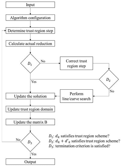 Flowchart of the hybrid trust region (HTR) algorithm.