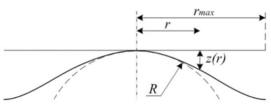 The developed method for reference softgauges generation based on a non-vertex solution is applied for the case of aspherical shapes. An asphere could be defined as a rotationally symmetric surface with a radius of curvature that varies gradually from the centre of the lens (Figure 9). Optical aspherical surfaces are very popular in the domain of optical design regarding their superiority over classical spherical lenses, as well as advancements made in manufacturing techniques [30]. Several formulations could be employed for the description of asphere; however, the most widely used is the one given in ISO 10110-12:2007 [30] called monomial formulation, given in (24). This formulation depends on the sag of the surface parallel to the radial symmetric axis , radius , radius of curvature , conic constant and monomial coefficients .
