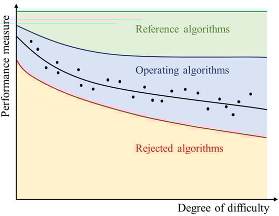 Figure 13 illustrates the performance of a given MZ fitting algorithm under test, as well as the acceptance domain for reference algorithms and operating ones. Since an algorithm of reference and an operating one do not have the same operational requirements, these two types of algorithms present two different characteristics in the degree of difficulty and performance measure domain.