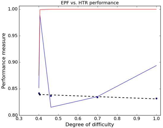 The obtained performance measure results are presented in Figure 14. Therefore, HTR is as stable as an algorithm of reference could be. This is due to its accurate values and the execution time that was not affected by the number of points in the dataset. EPF is unstable with an increased degree of difficulty, as it is sensitive to the number of points in the dataset.