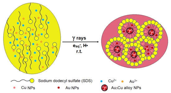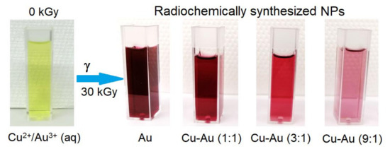 In addition, the water radiolysis produces hydroxyl radicals (OH●). These oxidizing species have a redox potential of +2.8 VNHE, and could oxidate the metal NPs [45]; therefore, their annihilation is mandatory. In the present work, Cu-Au alloy NPs are synthesized by irradiating an aqueous solution containing Cu and Au ions, in the presence of SDS used as a stabilizing agent and ethylene glycol used both as hydroxyl radical scavenging agent and as an aid to increase the efficiency of reducing metal ions.