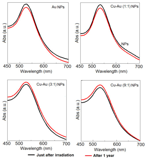 In addition, UV-VIS spectroscopy is used for determining the stability of metal nanoparticle solutions immediately after synthesis and after long-term storage under defined conditions. These solutions show high stability during storage for 1 year, in laboratory conditions (i.e., r.t, alternance day/night), obviously because their UV-Vis absorption spectra remain practically unchanged for Au NPs and Cu-Au (1:1) NPs, and a slight absorbance increase for Cu-Au (3:1) NPs and Cu-Au (9:1) NPs (Figure 4).