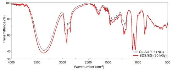 FTIR spectrum of Cu-Au (1:1) NPs compared to the irradiated SDS/EG system.