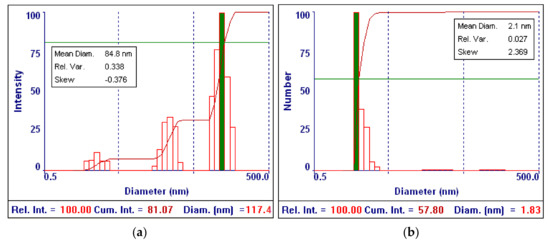 The hydrodynamic diameter (dH) that is equivalent to the effective diameter (deff) is calculated from the autocorrelation function of the intensity of light scattered from particles with the assumption that the particles have a spherical form. It is the diameter of a compact sphere that diffuses at the same speed as the particle being measured, having the same translational diffusion coefficient as the particle being measured, defined via the Stokes–Einstein equation (Equation (7)) [57,58].