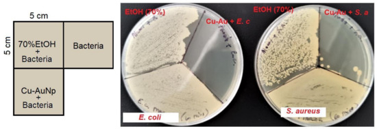 To simulate the real operating conditions, the antibacterial activity of Cu-Au NPs was tested on a laboratory surface [38] and compared with a solution of 70% ethanol. Briefly, two ceramic surfaces, previously cleaned with 70% ethanol solution (to eliminate any potential background contamination), were contaminated, separately, with 1 mL of Escherichia coli ATCC 25922 and Staphyloccocus aureus ATCC 9737, respectively (both with a cellular density of 0.5 McFarland (1.5 × 108 CFU/mL). Each contaminated surface was divided into three squares of 25 cm2. The first square was treated with 1 mL of 70% ethanol solution, the second one with 1 mL of Cu-Au (1:1) NPs, and the third one was kept untreated (i.e., only inoculated with bacteria). After a contact time of 1 h, the antibacterial efficiency was highlighted by collecting samples using a sterile applicator moistened in distilled water and their seeding on a MH agar medium for 24 h at 37 °C. After the incubation time, the number of colonies/25 cm2 was counted.