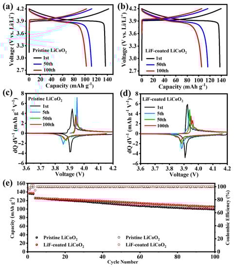 Figure 2a,b show the voltage profiles of pristine LCO and LiF-coated LCO in the 1st, 50th, and 100th cycles. The two electrodes exhibit comparable capacity and similar voltage profiles in the first three cycles, but LiF-coated LCO exhibits higher initial Coulombic efficiency (CE) (98.48%) than that of pristine LCO (95.92%). Afterwards, the voltage polarization of LiF-coated LCO is lower than that of pristine LCO. In the 50th cycle, the discharge capacity of LiF-coated LCO and pristine LCO is 116.2 and 110.5 mAh g−1, respectively. After 100 cycles, the discharge capacity of LiF-coated LCO (105.8 mAh g−1) keeps higher than that of pristine LCO (99.3 mAh g−1). Figure 2c,d present the capacity differential plots of pristine LCO and LiF-coated LCO with similar current density and peak location in the first cycle. In the 1st, 5th, 50th, and 100th cycles, the overpotential of pristine LCO is 0.010, 0.089, 0.066, and 0.075 V, while that of LiF-coated LCO is 0.010, 0.049, 0.051, and 0.070 V, demonstrating the reduced volage polarization of LiF-coated LCO upon cycling.