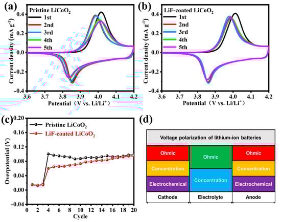 (a,b) Cyclic voltammetry curves of pristine LCO and LiF-coated LCO. (c) Overpotential of average voltage of pristine LCO and LiF-coated LCO. (d) Voltage polarization of lithium-ion batteries for cathode, electrolyte, and anode components.