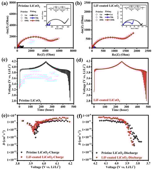 Electrochemical impedance spectrum of (a) pristine LCO and (b) LiF-coated LCO after the 1st, 5th, and 60th cycles. (c,d) Galvanostatic intermittent titration curves and (e,f) corresponding Li-ion diffusion coefficients of pristine LCO and LiF-coated LCO.