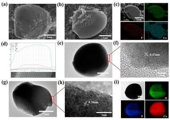 The morphology of the pristine LCO and LiF-coated LCO electrodes is shown in Figure 5a,b. The primary particles of LCO are irregular, but the surface of grains is smooth for uniform coating. Since the thickness of LiF coating is only ~50 nm. No obvious morphology differences can be found between pristine LCO and LiF-coated LCO, implying that the LCO electrode is not affected by the LiF coating. The F element is clearly observed in the elemental mapping (Figure 5c), and the linear scanning (Figure 5d) implies that the F element is evenly distributed on the surface of LCO electrode, confirming the successful coating of LiF on the LCO particles. The morphology of pristine LCO is checked by transmission electron microscopy (TEM) as shown in Figure 5e,f. The obvious lattice fringes of 0.47 nm are indexed as the (003) crystal plane of LCO. The morphology of LiF-coated LCO and HRTEM image are shown in Figure 5g,h. The accordant lattice fringes with the interplanar spacings of 0.20 nm are indexed as the (200) crystal plane of LiF. The F element is evenly distributed on the LCO grain surface as detected by the elemental mappings (Figure 5i), indicating that the LiF coating is homogeneously coated on the surface of LCO particle.