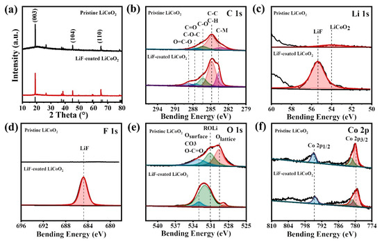 (a) the XRD of pristine LCO and LiF-coated LCO. (b–f) XPS spectra of the C 1s, Li 1s, F 1s, O 1s, and Co 2p photoemission lines collected from LCO and LiF-coated LCO electrodes.