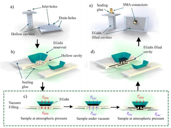 The fluid properties of LM allow for innovative manufacturing techniques such as 3-D printing. An LM array based on 3-D printing was described in []. The patch antenna array and the insulated part of the integrated feed network were printed using a ProJet 3500HDMax MultiJet printer. The printer supports coprinting of VisiJet M3 Crystal (3-D Systems) acrylic resin and VisiJet S300 (3-D Systems) support material by immersing the printed part in a warm ultrasonic cleaning tank (EZRinse-C, 3-D Systems) maintained at 55 °C, dissolving and flushing the sacrificial support through the small drainage hole. The prototype was kept in a vacuum oven at 55 °C for about 12 h to remove the solvent, and then the drain hole was sealed by applying photocurable polymer NOA63 (Norland Optical Adhesive 63). The cavity in the acrylic structure was filled with eutectic gallium indium (EGaIn), and a vacuum-driven process was used to form conductive elements. This process was a convenient method to rapidly prototype the complex array design to improve its electromagnetic performance. In addition to 3-D printing technology, the LM microfluidic channel also uses soft lithography technology. In the EGaIn thin line pattern production method based on soft lithography technology, the size of the produced thin lines can be scalable, uniform and without residue, and the line width on the same soft substrate can be from a single micron to a few millimeters []. Spray printing can be directly applied to various substrates, and liquid metal droplets can be sprayed on the cloth substrate [], sprayed and wiped on the PDMS substrate [], or quantitatively sprayed and packaged in silicone elastomer in combination with silicone [].