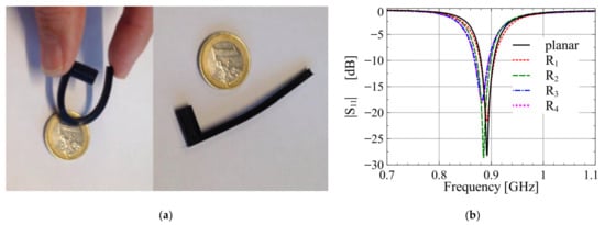(a) NinjaFlex 3-D printed sample in bent and relaxed state. (b) Measured impedance matching for different radii of curvature. Reprinted with permission from Ref. []. Copyright 2017 IEEE.