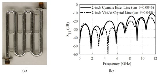 (a) A 3-D printed 2-ns delay line. (b) Measured S11 result of 2-inch 3-D printed coaxial lines using different dielectric material. Reprinted with permission from Ref. []. Copyright 2018 IEEE.