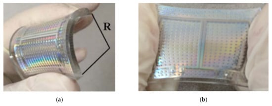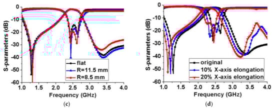 A flexible LM alloy bandpass filter (BPF) was described in Figure 4 []. The filter used soft lithography technology with multilayer lamination capabilities. Galinstan was selected as the LM and injected into the microfluidic channel through a syringe to form a complete filter. Figure 4c shows different situations with different curvature radii (R) in Figure 4a. In the measurement results of the plane and the curved filter with R = 8.5 mm and 11.5 mm, it can be seen that the curvature of the filter had little effect on the resonance frequency. When the filter was stretched from the original state to 10–20%, as shown in Figure 4b, its center frequency moved from 2.48 GHz to 2.42–2.36 GHz in Figure 4d. This showed that in the case of stretching, the increase in the size of the resonator of the filter results in a decrease in the resonant frequency. Experiments have studied the flexibility of the filter, including bending, twisting and stretching capabilities. The filter was not sensitive to bending and twisting, and the stretching behavior had a slight influence on its center frequency.