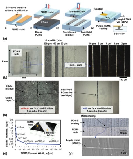 (a) Patterning process of EGaIn thin-line fabrication. (b) The widths of EGaIn lines from 2 µm to 200 µm with channel spacings of 100 µm. (c) The Patterned EGaIn line and surrounding PDMS surfaces with and without chemical surface modification and residue transfer technique for residue-free surfaces. (d) Measured EGaIn thickness inside of a PDMS mold as a function of PDMS channel width. (e) Cross-sectional view of EGaIn molded microchannel (top) and enlarged view of EGaIn molded thin film (bottom). Reprinted with permission from Ref. []. Copyright 2016 John Wiley and Sons.