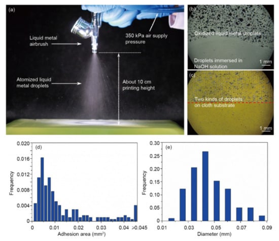 (a) Droplets generated by the airbrush. Light microscope image of spraying oxidized LM droplets and reduced droplets by immersing in NaOH solution on transparent glass substrate (b) and on cloth substrate (c). Statistical graph of the size distribution of oxidized droplets after impacting the substrate (d) and the droplets after removing their oxidized layer and shrinking into spheres (e). Reprinted with permission from Ref. []. Copyright 2016 Springer Nature.