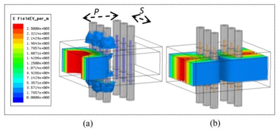 Electric field distribution of the proposed microfluidic switch: (a) OFF state (LM inserted); (b) ON state (LM removed). Reprinted with permission from Ref. []. Copyright 2017 IEEE.
