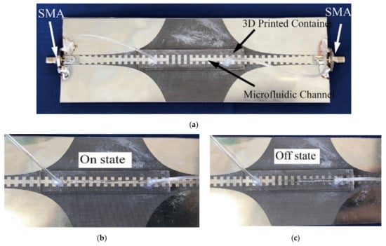 A radio frequency (RF) LM switch based on a spoof surface plasmon (SPP) transmission line is depicted in Figure 8 []. The LM in the syringe was separated from the air with mineral oil. After the LM was injected, its movement depended on the volume of the injected mineral oil. Using the good fluidity and high conductivity of LM, the signal was successfully blocked by cutting several units. The SPP transmission line can be modified by moving LM plug through microfluidic technology to obtain switches in different states. In the operating frequency band of 2–8 GHz, the insertion loss in the ON state was less than 1.5 dB and the isolation in the OFF state was greater than 13 dB. With the help of a higher precision manufacturing method and tuning the size of the proposed switch, its frequency band can be extended to millimeter wave band and even the terahertz band.