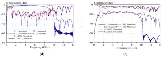Similarly, an LM-based (Galinstan) substrate integrated waveguide reconfigurable filter (BRF) consisted of four configurations [], which were dual-band configuration (DBC), low-frequency configuration (LBC), high-frequency configuration (HBC), and no-band configuration (NBC). Reversible and repeatable switching between configurations was achieved by filling or emptying some of the LM in the through holes and channels, thereby adjusting the cavity boundary and the transmission line to obtain the desired response. For single-frequency and dual-frequency filter configurations, the insertion loss was less than 1.9 dB, and the return loss was greater than 16 dB when the center frequency was 4.6 and 7 GHz. For a non-band (or full stop) configuration, the isolation effect on the entire band between 4 and 8 GHz was better than 36 dB. This design provided a new filter implementation that can be used to alleviate the problems caused by overcrowding of the radio frequency spectrum in microwave wireless communications and multi-band radar applications. A LM tunable fourth-order integrated waveguide quasi-elliptic bandpass filter in [] consisted of four frequency-tunable cross-coupled SIW resonators, creating multiple signal paths between input and output. The four SIW cavities had holes near their corners and were selectively filled with EGaIn to adjust the resonance frequency of the cavity. The measurement results showed that the filter could obtain four closely spaced passbands, and the center frequency could be discretely adjusted between 7.96 GHz, 8.12 GHz, 8.24 GHz and 8.39 GHz. A mechanically foldable and stretchable filter was proposed in [], which had flexibility and mechanical stability, and its sensitivity to deformation was small. The filter injected LM into the PDMS microfluidic channel, which was implemented using soft lithography technology. Through simulation and experiments, the manufactured filter had an insertion loss of 1.3 dB at a center frequency of 2.1 GHz, and a return loss of more than 10 dB over 1.6–2.6 GHz. Under the maintained electrical specifications, it could be stretched up to 20% with a radius of 8.5 mm and a bend of 11.5 mm. This process had broad application prospects in emerging nonplanar applications such as wearable electronics, medical wireless sensors, and bioelectronics. The LM bandpass filter (BPF) in [] had a similar structure to that in [], but the center frequency was slightly shifted.