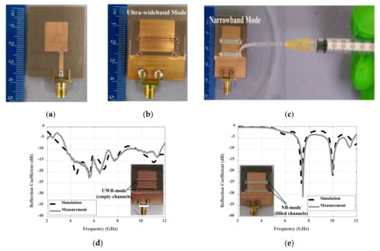 (a) Front view of the fabricated antenna. (b) Rear view of UWB mode. (c) Rear view of NB mode. (d) Reflection coefficient of UWB operating state. (e) Reflection coefficient of NB operating state. Reprinted with permission from Ref. []. Copyright 2020 IEEE.