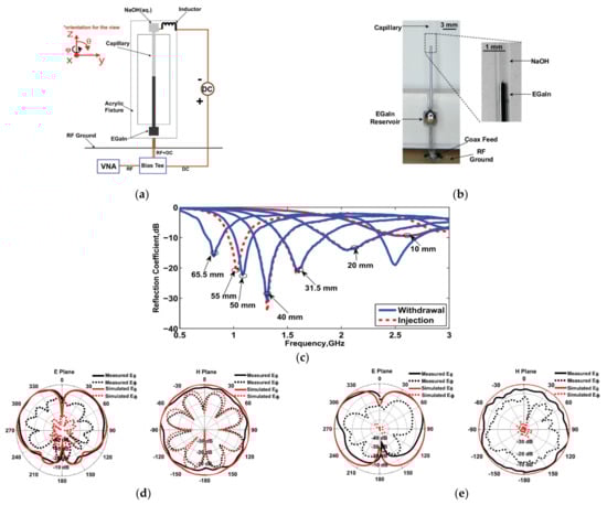 Using the electrochemically controlled capillarity (ECC) mechanism, bias voltage is used to control the electrochemical reaction on the surface of the LM immersed in the electrolyte solution. Under different DC bias conditions, the electrochemical reaction can remove or regenerate oxides on the surface of the LM, thereby enhancing or reducing the surface tension of the LM. The difference in surface pressure causes flow of the LM in the microfluidic channel. The process of using voltage to control the formation and removal of the oxide layer on the surface of the LM is reversible and repeatable, so the displacement of the LM in the microfluidic channel is reversible. Simultaneously, the LM can be pumped into and out of the microfluidic channel under electric control, and hence the LM can alter its position and length to a large extent. Electronically controlled microfluidic LM is capable of achieving continuous and large amounts of reconfigurable working conditions, which provides a new idea for the development of reconfigurable antennas and radio frequency devices. The ECC mechanism was used in [] to achieve continuous reconfiguration of a monopole antenna, as shown in Figure 10. We used EGaIn to fill the liquid storage tank at the lower end of the capillary and connect to the SMA connector through the short copper wire in the liquid storage tank. The electrolyte filled the upper liquid storage tank to establish a DC current loop. When a positive DC potential was applied to the LM, we injected EGaIn into the glass capillary and replaced the electrolyte in the channel. EGaIn returned to the storage tank, reversing the polarity of the voltage. The measurement tuning range of the LM antenna was from 0.66 GHz to 3.4 GHz, and the cross-polarization gain was still greater than 10 dB.