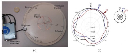 (a) Photograph of the microfluidic reconfigurable antenna. (b) Measured radiation patterns for configurations corresponding to rotations of 0°, 22.5° and 45°. Reprinted with permission from Ref. []. Copyright IEEE 2012.