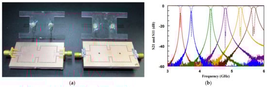 (a) Top (left) and bottom (right) views of the LM-based second-order bandpass filters. (b) Measured S-parameters of the proposed filter. Reprinted with permission from Ref. []. Copyright 2019 IEEE.