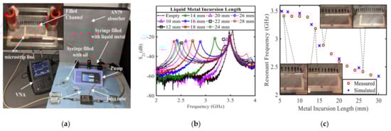 (a) Experimental device for measuring the S21 result of resonator proposed. Fabricated resonator filled with Galinstan and microchannels are shown in the upper left corner of illustration. (b) Resonator S21 spectra recorded by the VNA under different LM incursion length. (c) Record resonance frequencies of different metal lengths, including selected images. Reprinted with permission from Ref. []. Copyright 2020 IEEE.