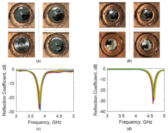 (a) EGaIn moved to a radius of 8 mm. (b) EGaIn moved to a radius of 6 mm. (c) Measured reflection coefficient of the unit cell with radius of 8 mm. (d) Measured reflection coefficient of the unit cell with radius of 6 mm. Reprinted with permission from Ref []. Copyright 2019 IEEE.