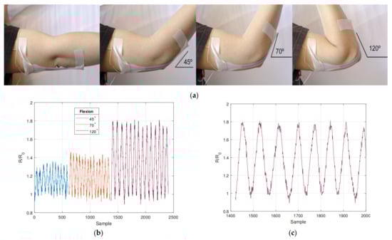 Resistive strain sensor attached to the elbow with three ranges of flexion. (a) Resistive strain sensor with elbow angle at 0, 45, 70, and 120 degrees. (b) Arm is moved from zero degrees to desired angle and back several times each, generating the waveform. (c) Data from repeated 120° flexion. Reprinted with permission from Ref. []. Copyright 2018 IEEE.