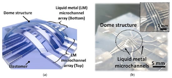 In [], the sensitivity of a highly scalable LM (Galinstan) sensor for temperature and humidity was studied, and it was found that the resistance of the sensor had a quasi-linear relationship with temperature changes without any hysteresis. The parallel design had a higher sensitivity to wetting, which was believed to be due to the specific path of the electric field lines. It was observed that as the sensor area was wetted by tap water, the capacitance changed as high as 76%. When a compressive force was applied, the capacitance values of all sensors were nonlinearly dependent and had small hysteresis. In capacitive sensing mode, all sensors were particularly sensitive to small forces (<4 N). The design can be used for the development of electronic skin and artificial nervous systems for biomedical and soft robotics applications. A new type of flexible pressure sensor based on PDMS and EGAIn was developed to detect various application pressures []. The LM-based electrodes were designed to form four capacitors. By studying the capacitance response of the device under different applied pressures, it was proved that the average capacitance change of the manufactured pressure sensor was linear, the sensitivity was 0.11%/MPa, and the correlation coefficient was 0.9975. The results obtained proved the feasibility of using LM-based electrodes to fabricate flexible pressure sensing devices. To be able to accurately monitor the external environment, a full-soft multiaxis force sensor based on a LM microchannel array consisted of a stretchable elastomer and Galinstan, as shown in Figure 17 []. The LM microchannel array was fabricated in multiple layers and positioned along the three-dimensional dome structure to detect multidirectional forces. By adjusting the height of the dome, the response of the multi-axis sensor to advection can be controlled. The sensor had high mechanical friction and electromechanical durability and can be applied in various research, including soft robots, wearable devices, and smart prostheses for artificial skin applications.