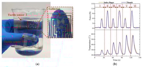 (a) Tactile sensors worn on the index finger and thumb of the human hand that were used to grasp a beaker of water; (b) Results of sensing force and temperature. Reprinted with permission from Ref. []. Copyright 2021 IEEE.