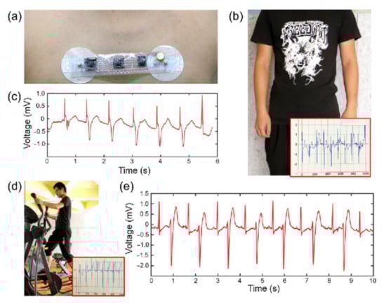 (a) LM e-Skin ECG device. (b) When the human body is stationary, the LM e-Skin collected the signal and displayed it on the computer. (c) ECG data processed by MATLAB. (d) When the human body moved, the LM e-Skin collected signal and displayed it on the computer. (e) ECG data in motion processed by MATLAB. Reprinted with permission from Ref. []. Copyright 2018 Springer Nature.
