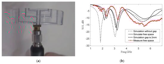 We proposed a 3-D printed tri-band LM antenna for a wrist-worn sensor that worked at 2.4, 3.3 and 5.5 GHz, as shown in Figure 20 []. The dielectric substrate and the micro-passband cavity that conformed to the human wrist were processed by 3-D printing technology, and then the micro-passband cavity was quickly filled with LM to form the radiating conductor of the antenna. The influence of the thickness of the 3-D printing substrate on the antenna radiation efficiency, and the interaction between the antenna radiation pattern and human tissues, were studied. When there was no gap between the human tissue and the bracelet, the medium loading effect of the human tissue was the largest, and the antenna resonance frequency shifted the largest. When this distance gradually increased to 2 mm, the antenna resonance frequency became smaller. Therefore, the influence of human tissue on the resonant frequency of the antenna was related to the gap distance between the human tissue and the bracelet. This verified the application of antennas based on 3-D printing technology and LM in the field of wearable and conformal electronic components. An antenna with more flexible structure and performance can be made according to actual application scenarios.