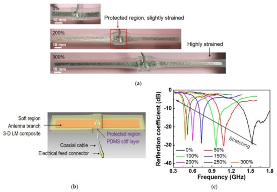 A tunable dipole flexible antenna that can be stretched up to 300% was developed in [], as shown in Figure 21. A 3-D LM network was embedded in an elastically soft elastomer as a conductive branch, and a rigid elastomer was coated on the rigid feed connector area as a protective layer to achieve mechanical fatigue resistance and a constant reflection coefficient. The antenna simultaneously presented a high-quality reflection coefficient around 30 dB and a wide adjustable resonant frequency from 1.55 to 0.45 GHz. This design is very promising for flexible electronics and wireless strain sensors.