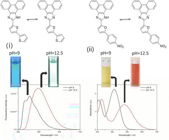 Depending on the functionalization of the imidazole ring, the -NH proton acidity can be changed. Together with the capacity of selectively binding cationic species, this turns imidazoles into potential optical chemosensors for a wide range of applications [] such as pH [,] and cation detection [,]. In addition to this application, imidazole derivatives have also found application as thermally stable fluorophores for Organic Light-Emitting Diode (OLED)s [], two-photon absorbing molecules [], nonlinear optical materials [], DNA intercalators [], and PDI photosensitizers []. Moreover, the introduction of π bridges of a heterocyclic nature, such as sulfur five-membered heterocycles, can improve the photophysical properties and provide additional binding sites for certain ions.
