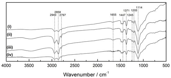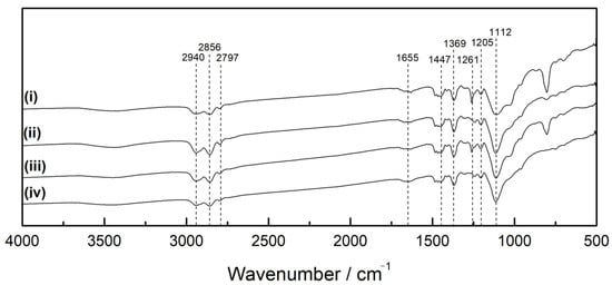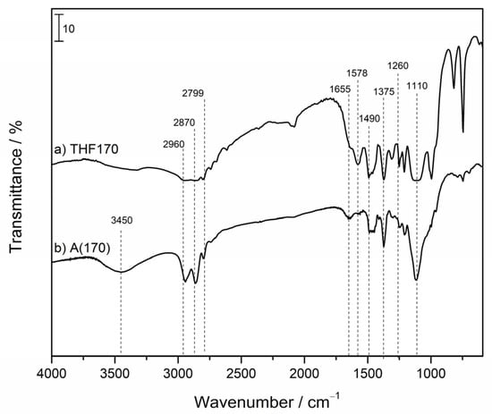 All spectra shows bands at 2940, 2856/2858, and 2797 cm−1, which are characteristic of C-H stretching vibrations []. These signals are typical of the organic backbone from the Jeffamine moiety and are also present in the precursor THF170 and pure hybrid A(170) spectra (Figure 3), which is according to the literature []. Bands at 1447 and 1369–1371 cm−1 are also assigned to the carbon backbone of the polyetheramine (simple bending vibrations), confirming that the backbone structure has not suffered any changes [], which is also according to previous studies reported []. It can be observed that the characteristic signals of the terminal groups of both precursors (3-GPTMS–epoxy ring, 3050 cm−1 []; Jeffamine THF 170–NH terminal group, 1578 cm−1) [] are not present, showing that the reaction was successfully achieved. The presence of the C–NH–C bond bending vibration, formed between the two precursors at 1655 cm−1, also confirms this, similarly to what was observed on pure A(170) spectra (Figure 3).