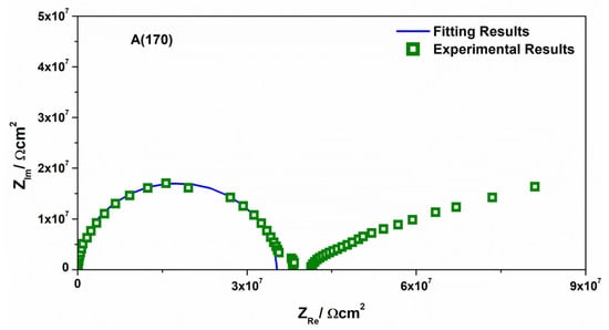 EIS analysis was used for the assessment of the dielectric properties (conductivity, capacitance, and electric permittivity) of the synthesized OIH materials, since this technique is a valuable one in the characterization of the material’s electrochemical properties [,]. Figure 6 shows the Nyquist plot obtained for the pure OIH matrix A(170) []. The Nyquist plots for the eight OIH doped materials as well as the fitting results are shown in Figure 7 and Figure 8. The equivalent electrical circuits (EEC) used for each sample were also introduced as an inset in each plot. The Nyquist plots show that the capacitive response over a wide range of frequencies, in which the high-frequency data are assigned to the dielectric properties of the material. The dielectric properties may indicate the potential of OIH materials to be used in alkaline samples since resistances values above 107 Ω cm2 are generally considered suitable for high pH levels such as the ones found in fresh concrete [,].