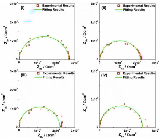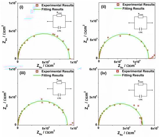 Table 2 show the values of resistance (R), capacitance (C), conductivity (σ), and relative permittivity (εr) obtained for the eight materials synthesized, which were determined using Equations (2)–(5), respectively. The values were normalized to the cell geometry dimensions, with AAu standing for the gold electrodes’ area, dSample for the thickness of the sample, and ε0 for vacuum permittivity.